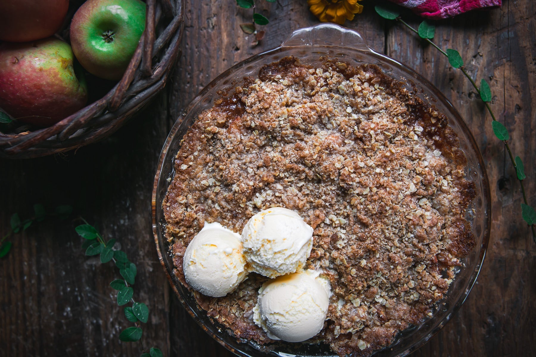 - Place the apple mixture into a baking dish and sprinkle the crumb over the apples.