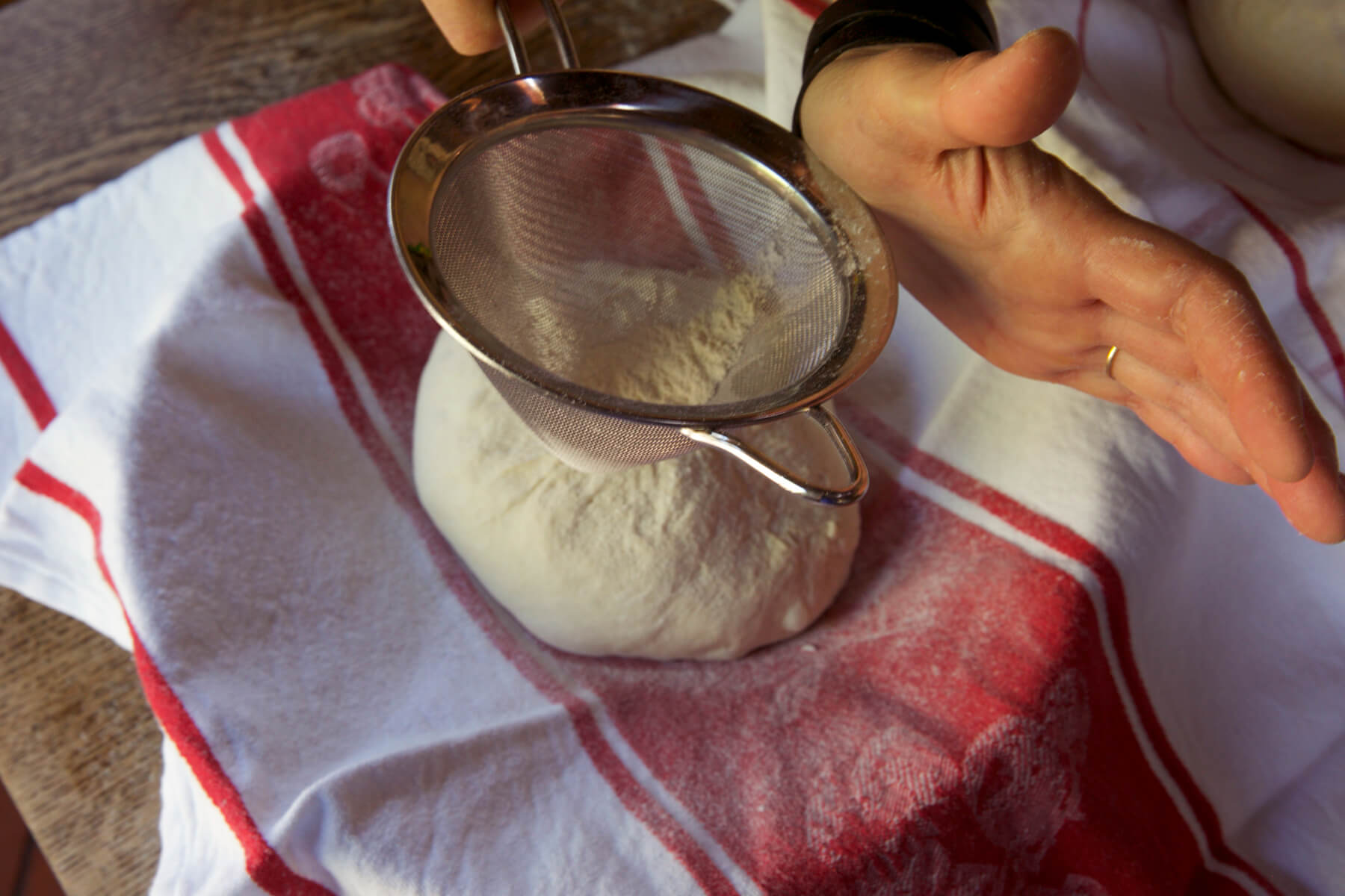 Once again, dust the part of the dough ball facing you with rice flour. This will prevent the dough from sticking to the tea towel while proofing.