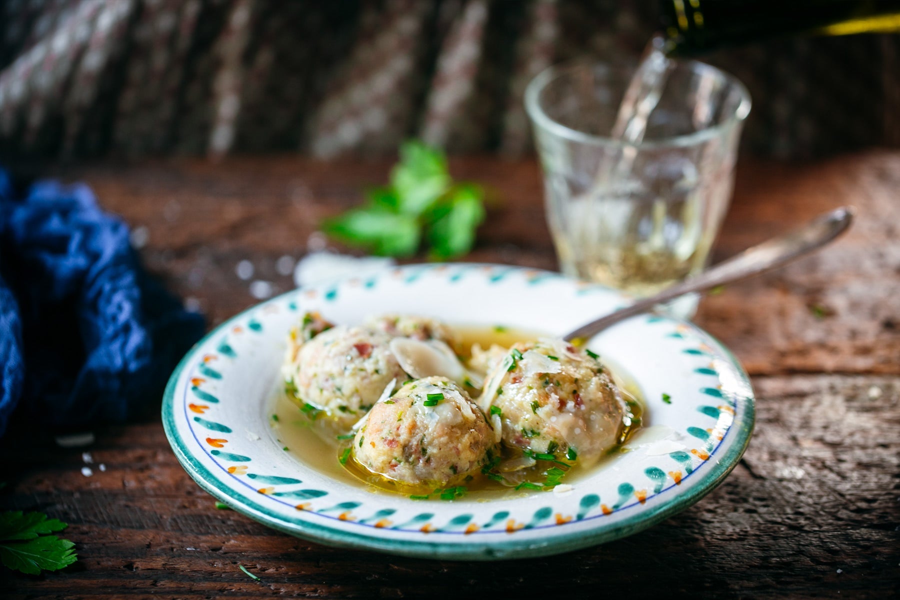 Remove them with a perforated ladle, and place a few into a soup plate. Pour some of the rich broth over the Canederli and garnish with the reserved chopped chives. Top everything off with a drizzle of olive oil and shavings of Parmigiano Reggiano. Enjoy!