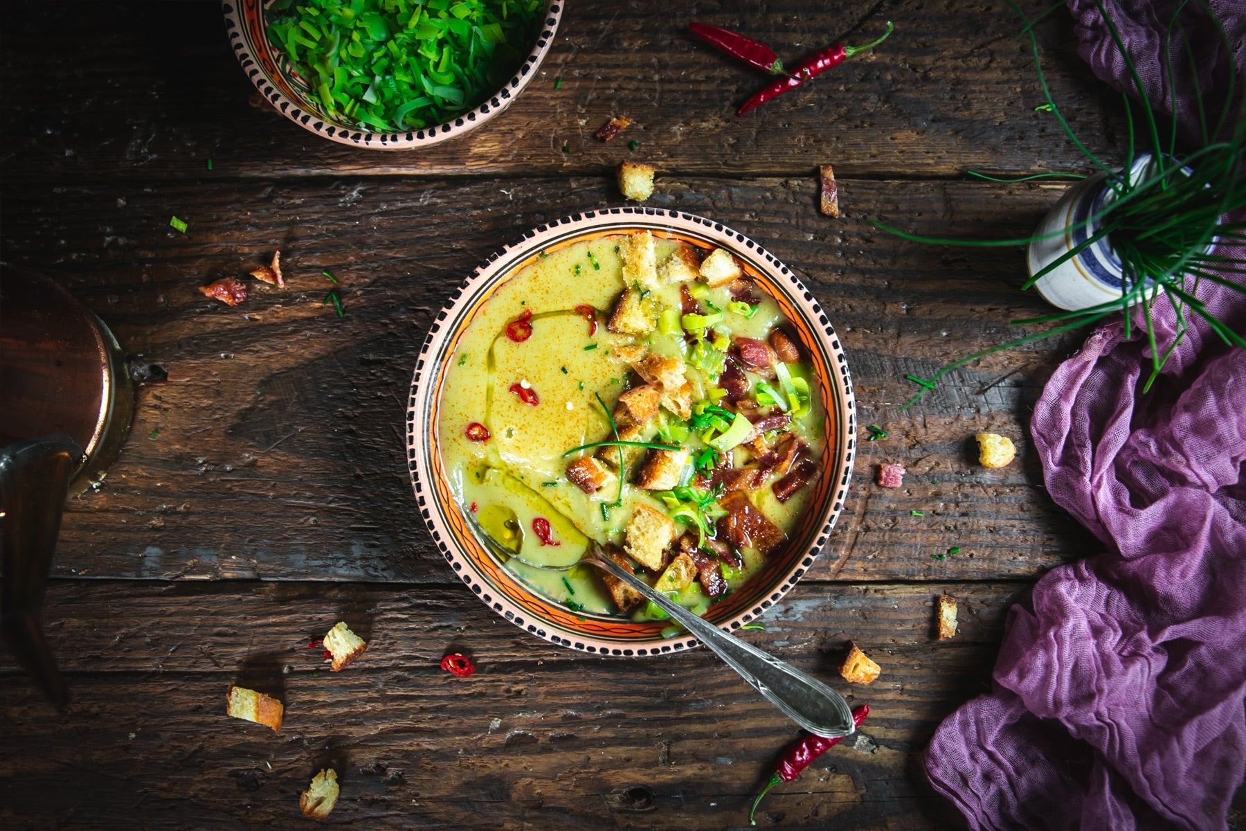 - Plate the creamed soup and garnish by topping it with the crumbled bacon, croutons, additional leeks that have been previously boiled, and thin slices of cayenne pepper. Finally top everything off with a nice drizzle of olive and serve immediately. Enjoy!