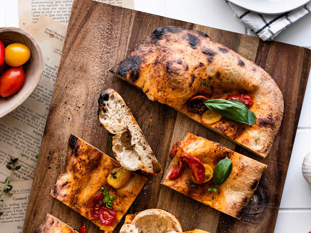 We partnered with Hannah of Make It Dough so she could put her spin on her hometown treat, the Philadelphia Tomato Pie. Hannah added fresh garden tomatoes and herbs, plus finishing touches of basil and parmesan cheese. The dough bakes up in 5 minutes, gets bubbly, and stays super tender thanks to the heat in our Margherita Gas oven. A wonderfully unusual pie to try this summer!