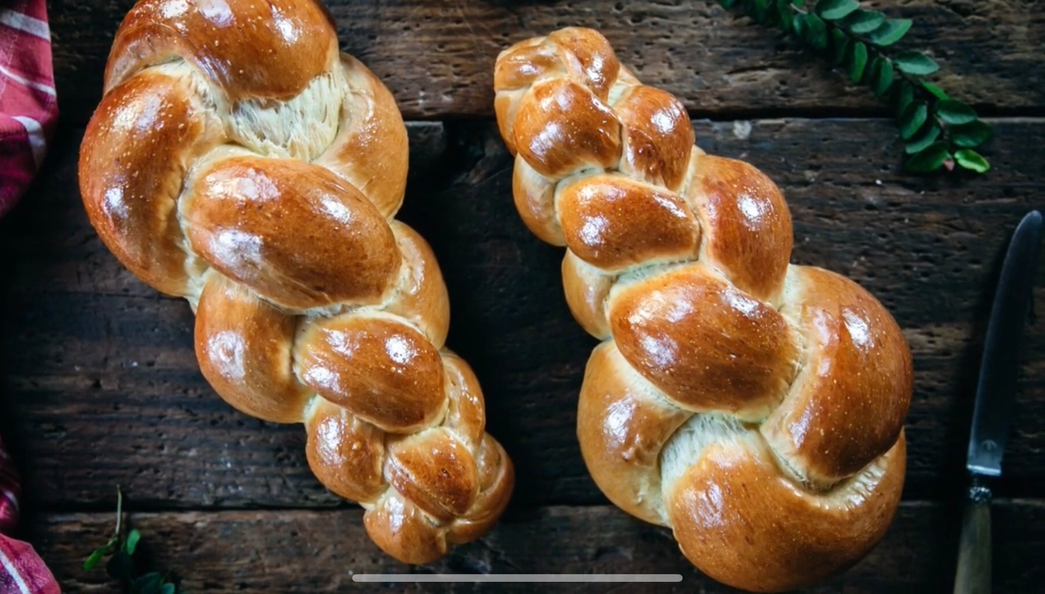 - Now the braiding of the dough. Place two strands on top of each other at 90 degrees thus forming a cross. Fold the left end of the horizontal strand all the way over to the right side. Simultaneously bring the right end toward the left side. Do the same process with the two vertical strands. Continue doing this while making sure to always cross the strands in the same pattern. Check out the video for extra help. Once braided, tuck the ends under, and with hands cupped on the braid, roll the loaf gently back and forth as to seal the loose ends below.