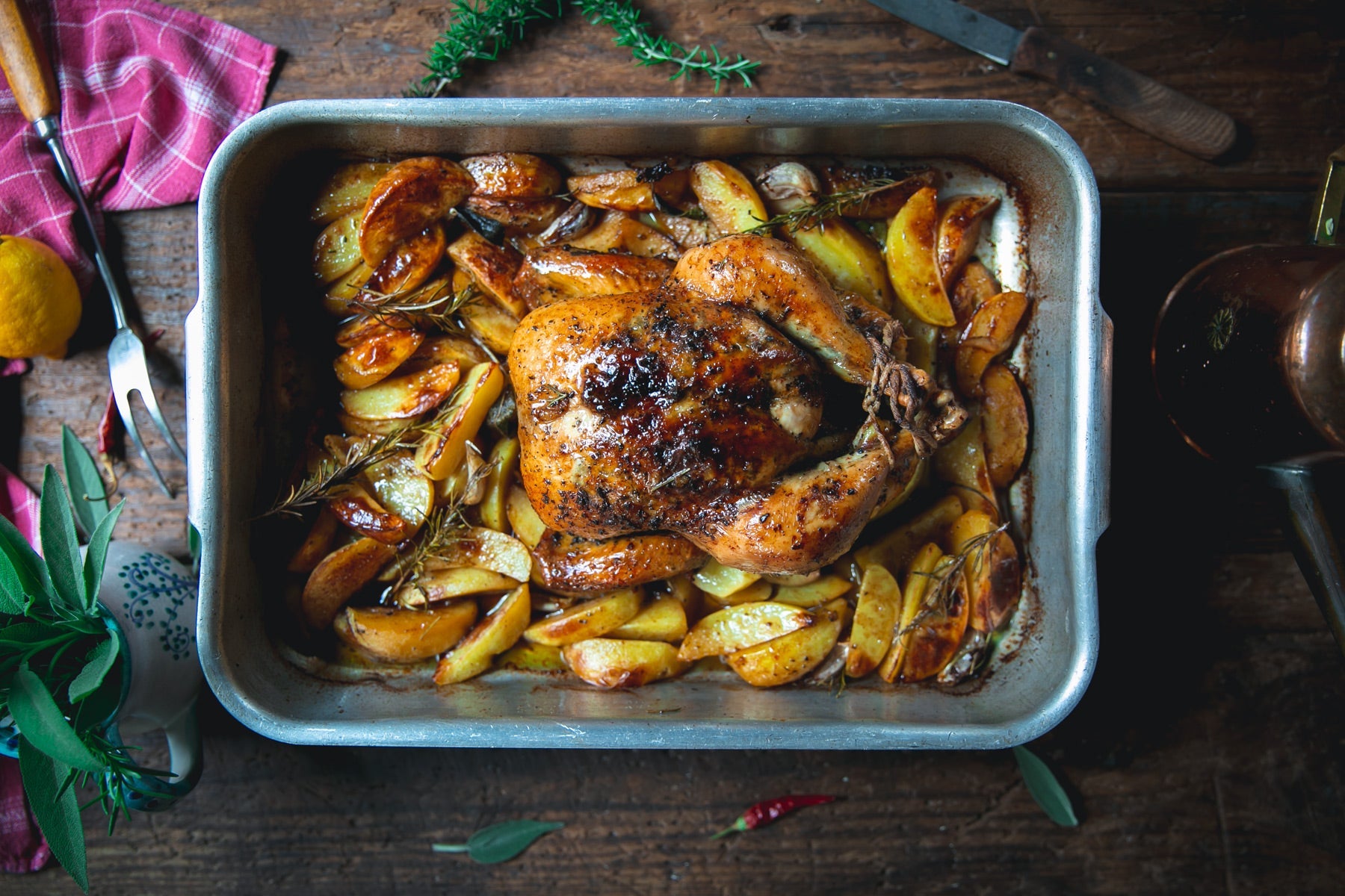 - After one hour, remove the potatoes from the water and add them around the chicken mixing them well with the juices in the pan as well as a good sprinkling of salt. Place additional sprigs of rosemary, sage leaves and cloves of garlic with the skin on (aglio in camicia), over the potatoes.