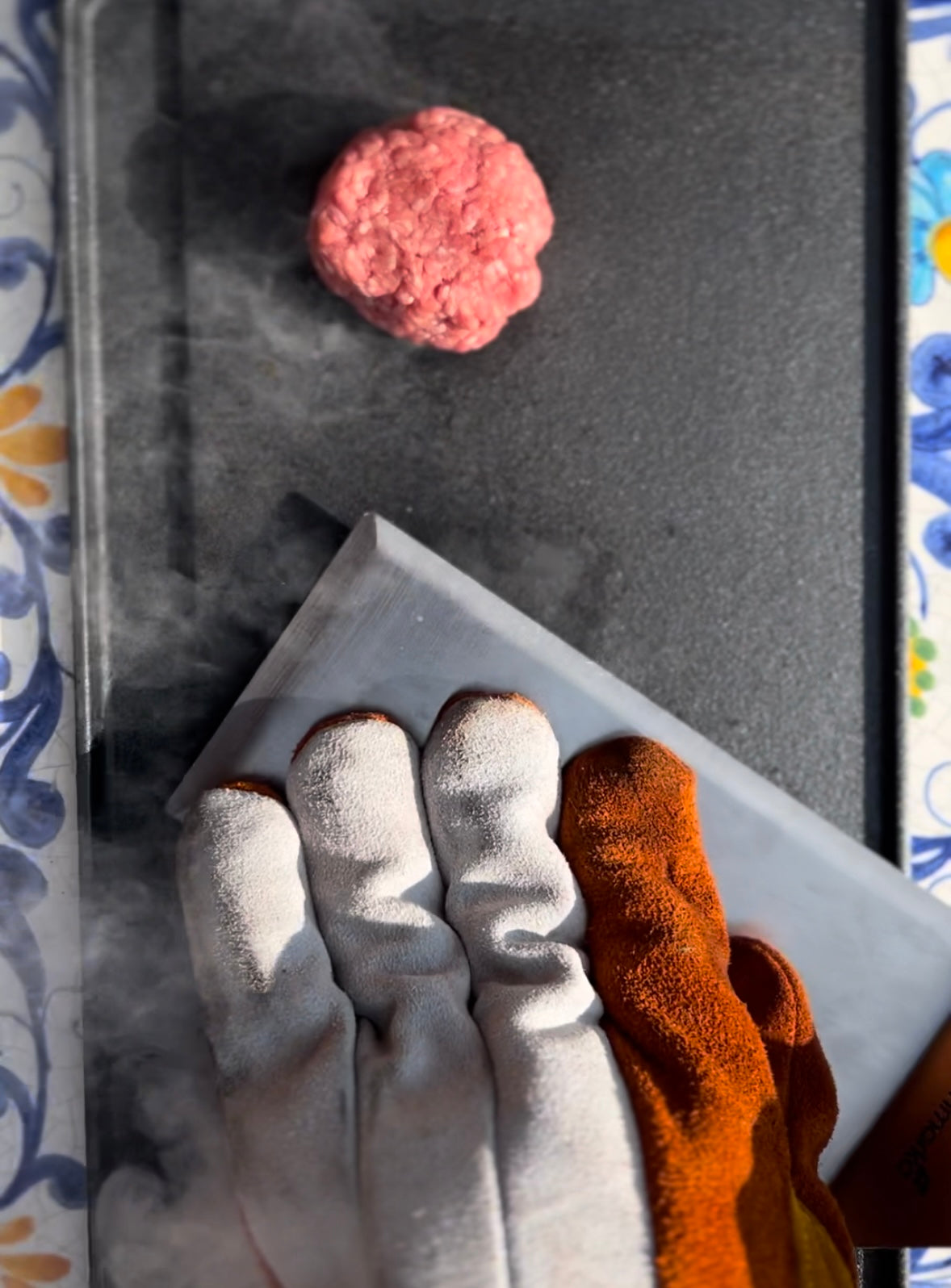 Smash with a spatula until evenly flattened (you may want to use a piece of parchment paper between spatula and beef to keep them from sticking together).