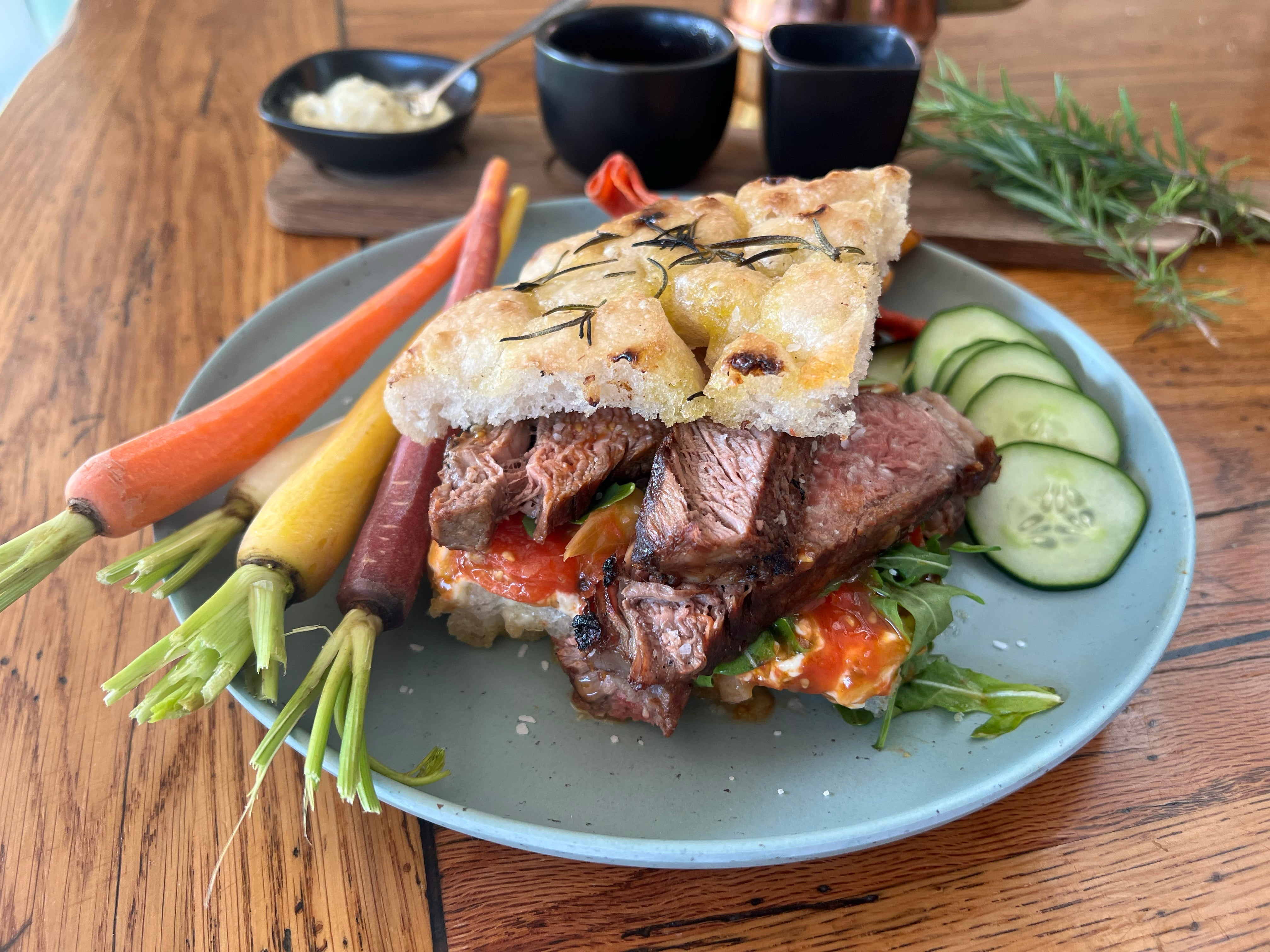Pat Lafrieda's signaturesteak sandwich is an absolute must at the US Open with it's fresh baked bread and choice meat. They sell about 500 each day at the event! This weekend we were inspired by Carlos Alcaraz's win. It inspired us to make a sandwich built for a champion! But not everyone can enjoy a fluffy focaccia so we whipped up a gluten-free version that is sheer bliss. Then we slathered it in a roasted tomato spread and garlic aioli with fresh arugula. Serve it up (get it!) with chips and a side of crisp veggies to complete this satisfying meal. Here's how to pull it all together!