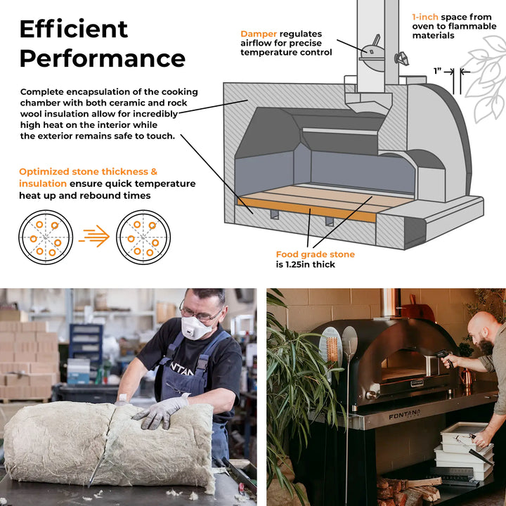 A full 12 centimeters of insulation surrounds the cooking chamber (back, sides, top, & underneath) to maximize heat retention and cooking efficiency. Our oven are so well insulated that the exterior is safe to the touch while at cooking temperature.